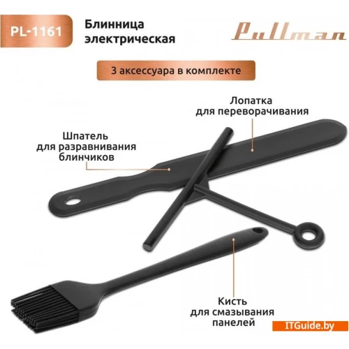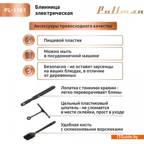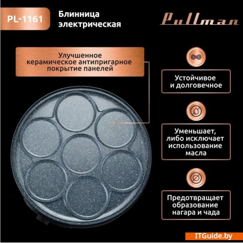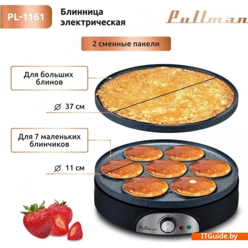 - Блинница Pullman PL-1161 — это идеальный помощник для приготовления вкусных блинов на завтрак или ужин. С диаметром 37 см вы сможете готовить как большие блины, так и маленькие, диаметром 11 см, что делает её универсальным решением для любой компании.