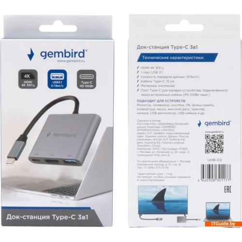 - С одним USB-A и одним USB-C портом, а также HDMI, вы сможете подключать все необходимые устройства без лишних проблем. Gembird UHB-D2 — это ваш надежный помощник в мире технологий!