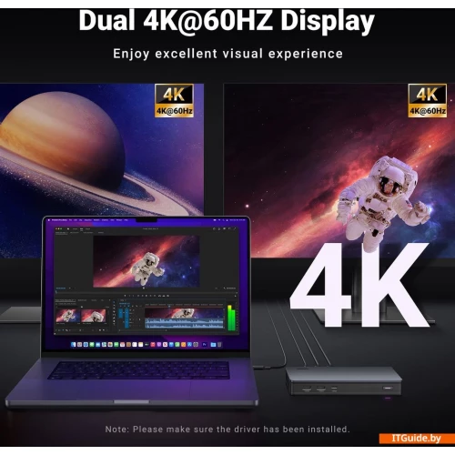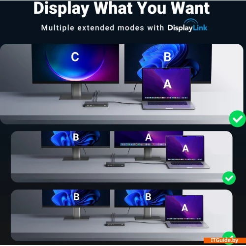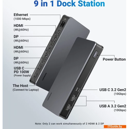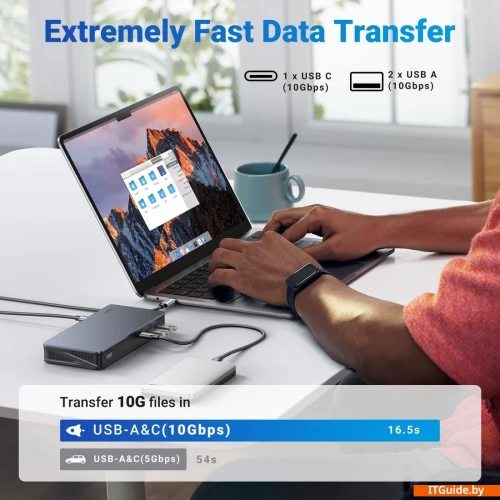 Все разъемы на адаптере | USB-A 3.2 Gen2 (10 Гбит/с), USB-C 3.2 Gen2 (10 Гбит/с), HDMI, DisplayPort, RJ-45, USB-C (только для зарядки) |