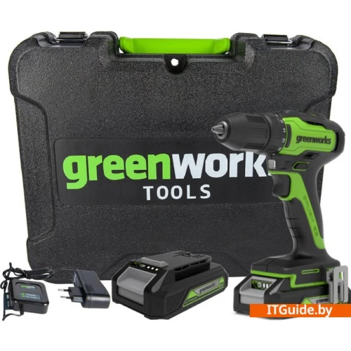 Комплектация | Дрель-шуруповертАккумулятор Greenworks 24V 2АчЗарядное устройство слайдер (0,5 А)Пластиковый кейсРуководство по эксплуатации |