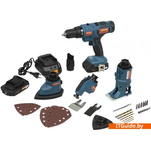Комплектация | Аккумуляторный инструмент Аккумуляторная батарея (2шт) Зарядное устройство Рабочая насадка-шуруповерт Рабочая насадка-лобзик Рабочая насадка для шлифования Рабочая насадка-реноватор Набор бит (6шт) и адаптер для бит Набор сверл (6шт) Пильное полотно Дельтовидная платформа для шлифования Шлифовальная бумага (4шт) Насадка для реноватора (2шт: шабер, пила) Патрубок для пылеотвода Инструкция по эксплуатации Инструкция по безопасности Кейс |