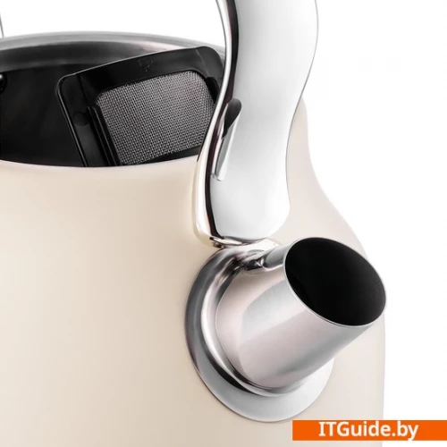 Современная конструкция чайника препятствует образованию накипи, облегчает уход, значительно снижает шум при нагревании воды. В носике чайника расположен съёмный фильтр от накипи, который задерживает частички накипи и предотвращает их попадание в чашку.