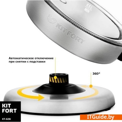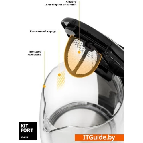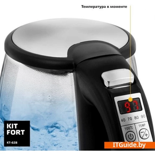 Электрический чайник с терморегулятором Kitfort КТ-628 может не только вскипятить воду, но и нагреть ее до температуры 40, 70, 80 и 90 °С, что очень удобно при заваривании различных сортов чая. Температура 40 °С пригодится для приготовления детского питания. Чайник также оснащен функцией поддержания температуры. Температура воды контролируется встроенным в дно чайника термодатчиком. Корпус чайника выполнен из стекла, а крышка и подставка — из сочетания пластмассы и нержавеющей стали. Мерная шкала нанесена на прозрачную часть корпуса.