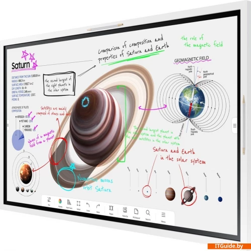 Режимы пера и кисти позволяют свободно выражать идеи на экране, а стирание контента жестом руки делает процесс максимально естественным. Панель инструментов, цветовая палитра и функция заметок поверх любого контента открывают широкие возможности для интерактивной работы.