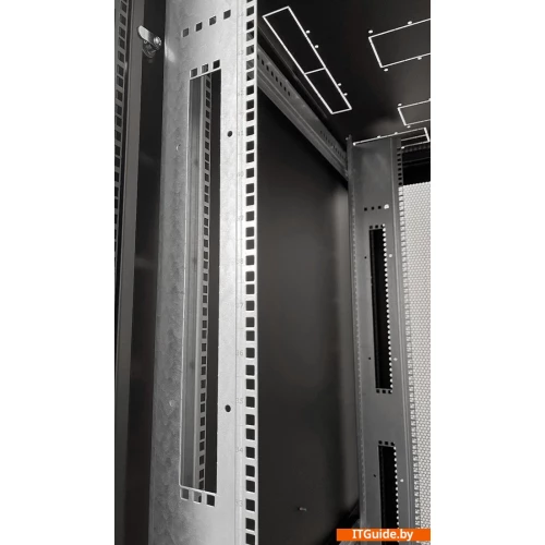 • Новая конструкция рам с полузамкнутым профилем позволила увеличить несущую способность шкафа до 1200 кг. Также благодаря ей шкафы соединяются между собой без дополнительных крепёжных элементов. Внутренняя поверхность рам по вертикали получила перфорацию, создающую дополнительное монтажное пространство для установки органайзеров, шин заземления и прочих аксессуаров.