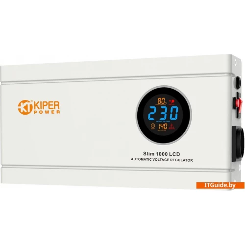 - Стабилизатор напряжения Kiper Power Slim 1000 LCD (1000ВА/600Вт) — это компактное и надежное решение для защиты бытовой и офисной техники от колебаний напряжения. Устройство отличается тонким корпусом, экономит пространство и при этом обеспечивает стабильную работу подключенных приборов.