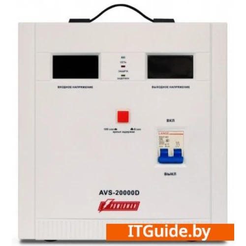 Powerman AVS 20000D - однофазный стабилизатор мощностью 20000ВА. Обеспечивает для подключенного оборудования уровень напряжения 220В (отклонения не превышают допустимые по ГОСТ Р 54190-2010 «Нормы качества электрической энергии»). В диапазоне напряжений сети 140В - 260В обеспечивает выходное напряжение 220В ± 8% . При слишком высоком или слишком низком напряжении сети, которое стабилизатор не может компенсировать, а также при значительной перегрузке он отключает нагрузку. Питание нагрузки подключается автоматически при восстановлении напряжения сети до рабочего диапазона, либо при снижении температуры. Подключение, после защитного отключения нагрузки или полного отключения сети, происходит с временной задержкой 6сек / 180сек. Высокая перегрузочная способность трансформатора и наличие функций защиты обеспечивает безопасную эксплуатацию в непрерывном режиме. Помимо регулировки напряжения стабилизатор значительно снижает уровень импульсных и высокочастотных помех, попадающих в нагрузку.