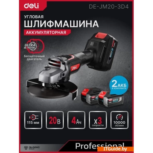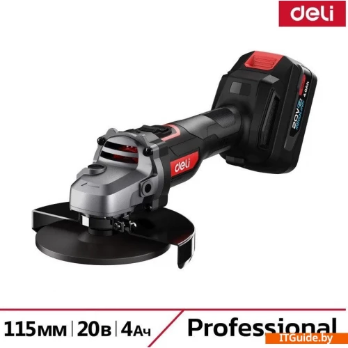 - Аккумуляторная угловая шлифмашина Deli DE-JM20-3D4 — это мощный и универсальный инструмент, который отлично подходит как для профессионалов, так и для любителей. С двумя Li-Ion аккумуляторами с технологией Innolink, напряжением 20 В и емкостью 4 Ач, вы получите стабильную и длительную работу, что делает её идеальной для шлифовальных и резательных задач.