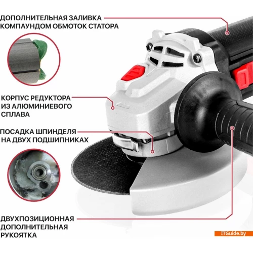 Комплект поставки | - Шлифмашина угловая,- дополнительная рукоятка, - защитный кожух, - опорный фланец, - прижимной фланец, - ключ, - инструкция по эксплуатации, - коробка. |