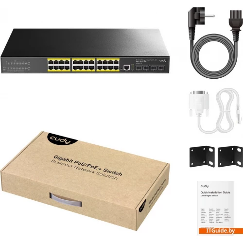 - 24-портовый коммутатор Cudy GS5024PS4 является управляемым сетевым устройством 3-го уровня, предназначенным для построения современных корпоративных сетей с высокой пропускной способностью и поддержкой питания по технологии PoE. Коммутатор оснащен 24 гигабитными портами RJ-45 с поддержкой PoE по стандартам 802.3at/af, а также четырьмя 10G SFP+ слотами для подключения оптических модулей, что обеспечивает гибкость при организации магистральных соединений.